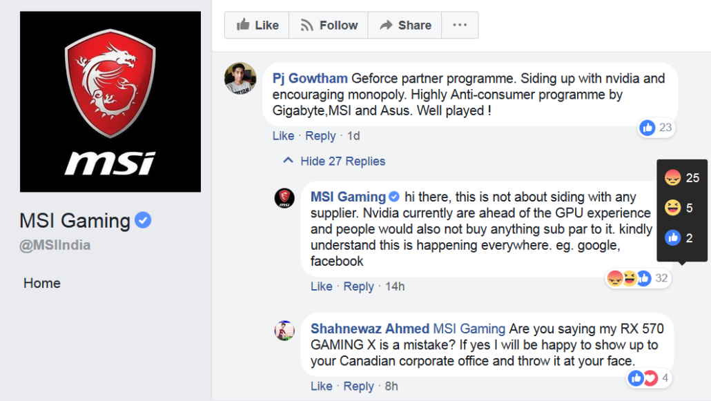 در همین راستا یک مسئول در صفحهی فیسبوک MSI Gaming در هند در پاسخ به سوال کاربران در مورد پیوستن MSI به این برنامه تلویحاً این موضوع را تایید کرده و گفته است که MSI چارهی دیگری نداشته است. نکتهی جالب در این پاسخ این است که این مسئول اعلام کرده در حال حاضر انویدیا در زمینهی تکنولوژی گرافیک سرآمد بازار است و مردم چیزی پایینتر (AMD) از آن را نمیخرند.