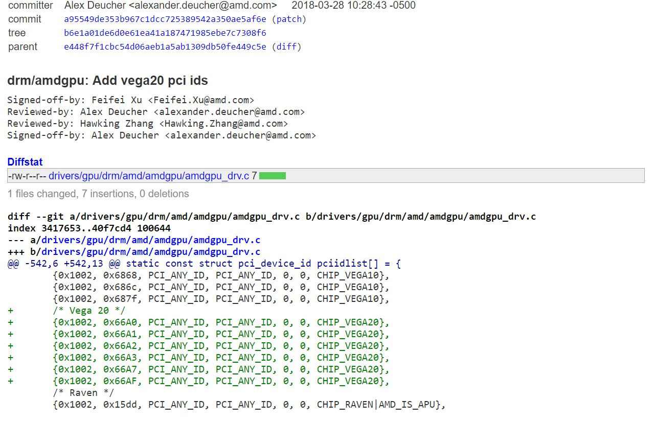اخیراً شش شناسه سخت افزاری از طریق یک وصله به درایورهای لینوکس AMD اضافه شده اند که همگی متعلق به یک پردازنده گرافیکی جدید با کُد Vega 20 هستند. همانطور که می دانید Vega 10 فعلی یک ماژول متشکل از چندین تراشه (موسوم به MCM) است که یک پردازنده گرافیکی 14 نانومتری و دو پکیج حافظه 10 نانومتری HBM2 را در خود جای داده است. ارتباط اجزای این ماژول از طریق یک لایه ویژه در سطح قطعه سیلیکونی صورت میگیرد. حالا به نظر میرسد AMD در تلاش برای افزایش فرکانس و احتمالاً راندمان Vega 10، یک نسخه جدیدتر به نام Vega 20 عرضه میکند که در اصل همان Vega 10 اما با پردازنده گرافیکی ساخته شده با یک فناوری جدیدتر است.
