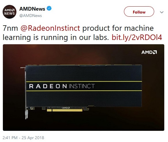 AMD با انتشار یک تویت در صفحه رسمی خود، تأیید کرد اولین محصول 7 نانومتری مبتنی بر ریزمعماری VEGA برای استفاده داخلی تولید شده است. اولین محصول 7 نانومتری AMD یک شتاب دهنده مخصوص یادگیری ماشین به نام Radeon Instinct است. هرچند دست کم این محصول با موفقیت با فناوری ساخت 7 نانومتری تولید شده است، اما میتواند فاصله بسیار زیادی با محصول نهایی داشته باشد، چراکه هنوز مشخص نیست ویژگیهایی چون بازدهی انرژی، نشت جریان و نسبت تراشههای سالم به تراشههای معیوب ایده آل باشد.