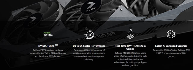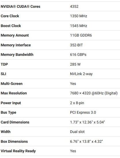 اخیراً بر روی وب سایت رسمی برخی سازندگان کارت گرافیک کارتهای GeForce RTX 2080 Ti و RTX 2080 رویت شدهاند که نه تنها عرضه آنها را تأیید میکند، بلکه اطلاعات تازهای نیز در اختیار ما میگذارد. حالا می دانیم RTX 2080 Ti داری 4352 هسته CUDA با فرکانس پایه هسته 1350 مگاهرتز و فرکانس بوست 1545 مگاهرتز است. این کارت به 11 گیگابایت حافظه ویدئویی GDDR6 با رابط 352 بیتی مجهز است که پهنای باند حافظه 616 گیگابایت در ثانیه را تأمین میکند.