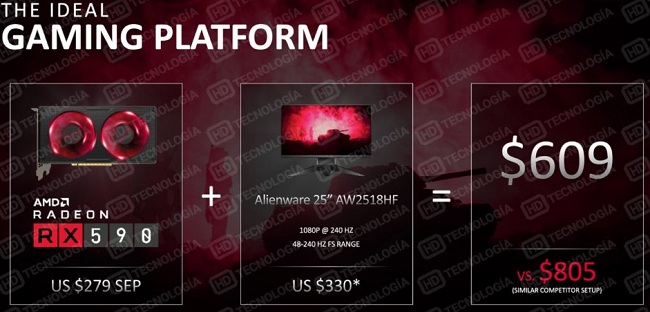 اسلاید دیگر قیمت و زمان عرضه RX 590 را با خود دارد. کارت گرافیک RX 590 از ماه سپتامبر با قیمت 279 دلار روانه بازار میشود. جالبتر اینکه به نظر میرسد مدل مرجع به نورپردازی LED سرخ و یک جفت فن تجهیز شده است.