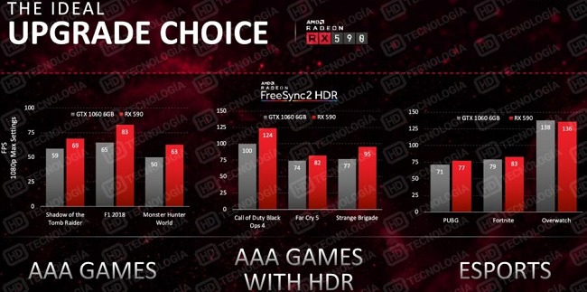 کارایی RX 590 چندان بالا نیست و هنوز هم رقابت با GeForce GTX 1060 رقیب را دنبال میکند. نمودار بالا مقایسه کارایی مدل مرجع RX 590 با مدل 6 گیگابایتی GTX 1060 را نشان میدهد، با این حال مشخص نیست نمونه استفاده از GTX 1060 به حافظه 9 گیگابیتی مجهز بوده یا نه.