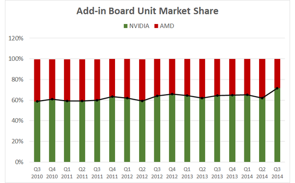 طبق آمار اعلام شده شرکت NVIDIA توانست با فاصله قابل توجهی رقیب دیرینه خود AMD را در بازار فروش کارت گرافیک پشت سر بگذارد. این شرکت توانسته است بخصوص در سه ماهه سوم امسال بیش از 70 درصد سهم فروش بازار را به خود اختصاص دهد و رقیب خود AMD را به 30 درصد محدود کند.