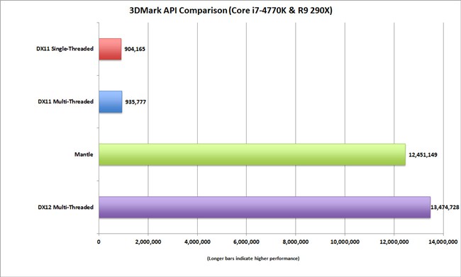 بنا به گزارش PC World، در تست 3DMark کارایی کارت گرافیک AMD R9 290X با استفاده از رابط DirectX 12 بیش از 1300% بالاتر از DirectX 11 نشان داده شدهاست. این در حالی است که همین کارت گرافیک با استفاده از Mantle افزایش کارایی 1200% را تجربه کردهبود.