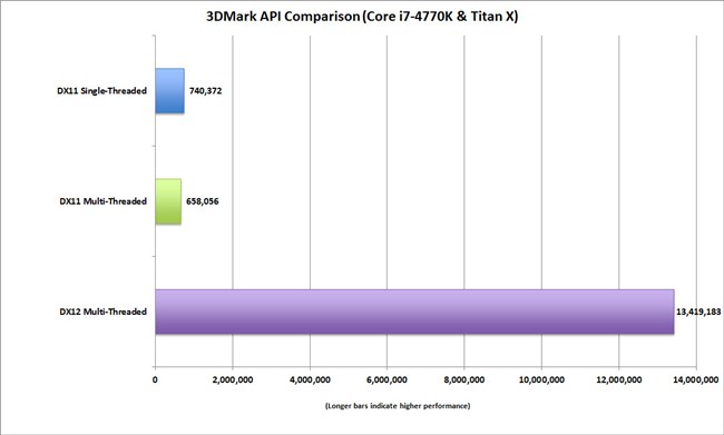 در تست دیگر، کارت گرافیک Nvidia GTX Titan X مورد بررسی قرار گرفته که در این مورد نیز افزایش حدود 20برابری کارایی در DirectX 12 برتری این API جدید را بیش از پیش به رخ میکشد. (از آنجایی که رابط Mantle تکنولوژی انحصاری کمپانی AMD است این API در نمودار Titan X حضور ندارد.)