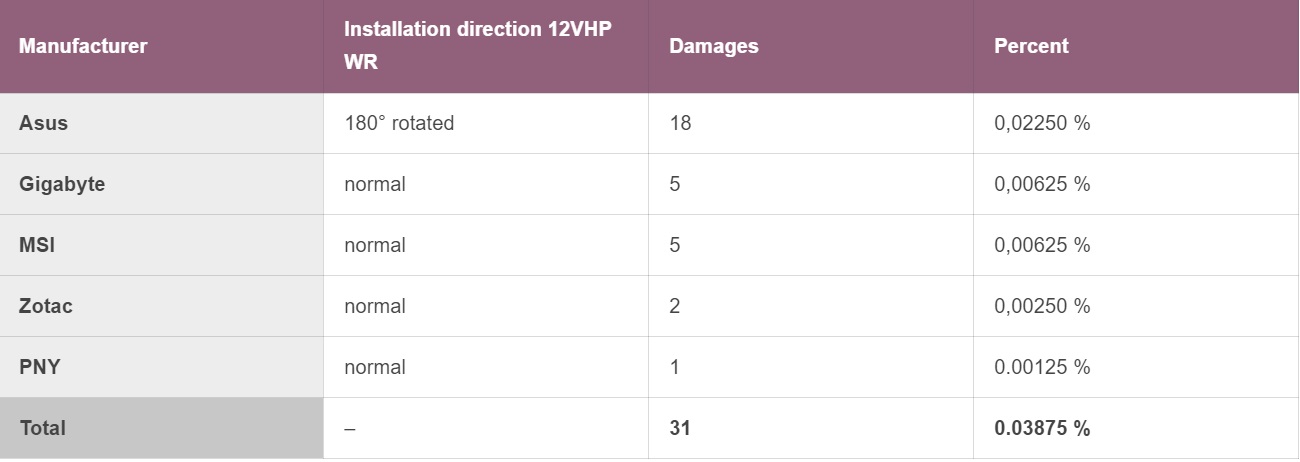 به گزارش igorslab، این جدول نشان میدهد که بخش قابل توجهی از کارتهای گرافیک دارای کانکتور چرخش یافته توسط شرکت ایسوس تولید شده و از قضا این کارتها بالاترین آمار مربوط به ذوب شدن کانکتور را دارند.