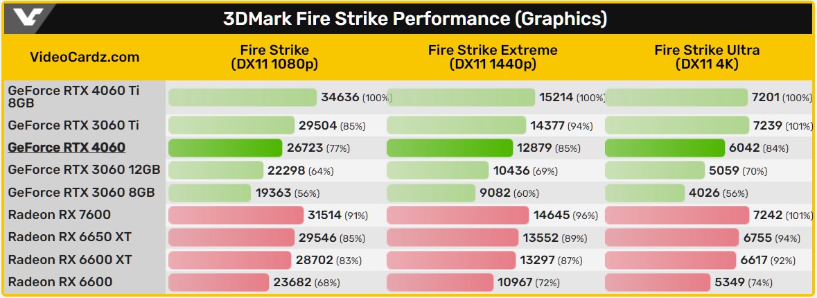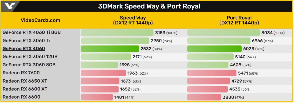 نتایج به دست آمده از اپلیکیشن 3DMark حاکی از آن است که کارت گرافیک RTX 4060 به طور متوسط 22.8 درصد از کارت گرافیک RTX 4060 نسخه ۱۲ گیگابایتی و 47.9 درصد سریعتر از نسخه ۸ گیگابایتی سریعتر عمل میکند.