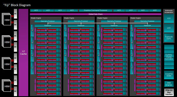 پرچمدار آتی پردازنده های گرافیکی AMD که با اسم رمز Fiji شناخته می شود، افتخار چندین اولین در جهان را از جمله بکار گیری تراشه های حافظه HBM، قرار دادن تراشه های حافظه بر روی قطعه سلیکونی و لایه فیزیکی ویژه ای به نام Interposer که تراشه های حافظه را با پردازنده گرافیکی پیوند می دهد، برای خود به ثبت رسانده است. اکنون بلوک دیاگرامو جزئیات کامل این تراشه که خود AMD از آن به عنوان پیشرفته ترین و پیچیده ترین تراشه دنیا یاد می کند، منتشر شده است.