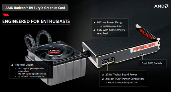 با فرکانس هسته 1050 مگاهرتز و فرکانس حافظه 500 مگاهرتز (پهنای باند 512 گیگابایت بر ثانیه) در کارت گرافیک Radeon R9 Fury X, تراشه Fiji پردازنده گرافیکی را با قدرت محاسباتی 8.6 ترافلاپس در دل خود دارد که توان آن از 7 ترافلاپس پرچمدار انویدیا؛ GTX Titan X بیشتر است. مدل مرجع Radeon R9 Fury X برای تامین توان مورد نیاز خود از دو کانکتور 8 پینی استفاده می کند، اما نگران نباشید، توان مصرفی این کارت حداکثر 275 وات است که تنها 25 وات از GTX Titan X مصرف بیشتری دارد اما 20% توان محاسباتی بیشتری ارائه می کند.