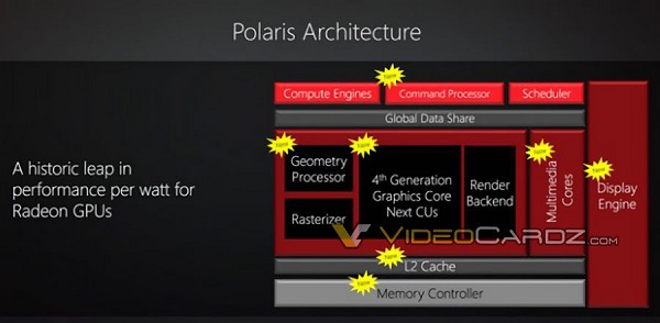 طبق آنچه که تاکنون میدانیم، در این معماری طراحی پردازنده گرافیکی دستخوش تحول گردیده و بخشهای جدید Command Processor، اGeometry Processor، هستههای چند رسانهای و موتور نمایشگر به آن افزوده شد است. در کنار این بخش هاس جدید، حافظه کش سطح دوم و کنترلر حافظه نیز ارتقا یافته است. AMD Polaris به رقابت مستقیم با معماری Pascal انویدیا خواهد پرداخت و این باور وجود دارد که در هر دو آنها از حافظههای با پهنای باند بالا HBM2 استفاده میشود.