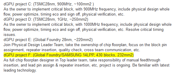پروژه F یک اسم رمز دیگر برای تراشههای است که در مقر مرکزی AMD طراحی شده. از اطلاعات درز یافته در گذشته این درس را گرفتهایم که چنین نامهایی به محصولاتی مربوط میشود که طراحی آنها به پایان رسیده و در مرحله بررسی های اولیه برای اصلاحات بیشتر به سر می برند. بنابراین هنوز هیچ اطمینانی وجود ندارد که پروژه F در قالب یک محصول در اختیار مصرف کنندگان قرار گیرد. بر اساس اطلاعات ارائه شده در پروفایل یکی از کاربران سابق AMD در شبکه Linkedin، پروژه F یک پردازنده گرافیکی مجزا است که با فناوری ساخت 14 نانومتری بسیار کم مصرف طراحی میشود. چنین تراشهای میتواند توسط سامسونگ یا Global Foundaries تولید شود. فناوری ساخت 14 نانومتری بسیار کم مصرف یا به اختصار 14LPP، نسل بعدی فناوری ساخت 14 نانومتری است که از نظر کارایی و بهره وری از انرژی، تا 15 درصد بهبود را نسبت به فناوری فعلی به ارمغان میآورد.