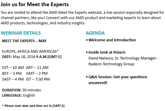 این رویداد تنها یک یک روز پس از منقضی شدن NDA (توافق نامه منع افشای اطلاعات) کارت گرافیک GTX 1080 برگزار میشود. در روز 17 ماه میلادی جاری، اولین بررسیهای عملی از کارت گرافیک GTX 1080 توسط وب سایتهای مشهور منتشر میشود. در چنین وضعی میتوان ارائه اعداد و ارقامی از کارایی کارتهای گرافیک آتی AMD و همچنین ارائه جزئیاتی از معماری Polaris از جمله بهره وری از انرژی را متصور شد اما معرفی محصولات جدید، بسیار بعید به نظر میرسد. به عبارتی دیگر، ممکن است هدف از این کنفرانس، امید دادن به کسانی باشد که منتظر کارتهای جدید AMD نشستهاند تا آنها را از خرید کارتهای GTX 1080 و GTX 1070 بازدارند، چراکه اعداد و ارقام خیره کننده کارت گرافیک GTX 1080، حتی برخی از وفادارترین طرفداران AMD را دچار تردید کرده است.