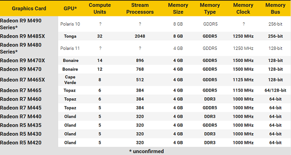 قدرتمندترین پردازنده گرافیکی این سری Radeon R9 M485 با برخورداری از 2048 پردازنده جریانی است که گمان میرود ریبرند Radeon R9 M395X باشد. در همین حال انتظار میرود AMD ظرف ماههای باقی مانده، حداقل سه پردازنده گرافیکی M485X، M470X و M470 را برپایه معماری جدید Polaris و با بکارگیری فناوری ساخت 14 نانومتری FinFET معرفی کند. با توجه به مشخصات بسیار کمی که AMD در وب سایت خود از سری Radeon M400 ارائه کرده، پیش بینی میشود در خلال نمایشگاه کامپیوتکس پیش رو، شاهد رونمایی رسمی و ارائه مشخصات کامل آنها باشیم.
