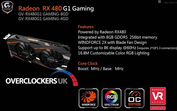 گیگابایت نیز برای علاقمندان یک کارت گرافیک Radeon RX 480 تمام کاستوم در دو مدل 4 و 8 گیگابایتی تدارک دیده است. با اینکه هنوز Radeon RX 480 G1 GAMING ( با شناسه GV-RX4801 GAMING-8GD و GV-RX480G1 GAMING-4GD) هنوز در وب سایت رسمی گیگابایت قرار نگرفته، اما تصاویر و اطلاعاتی از آن لو رفته است.