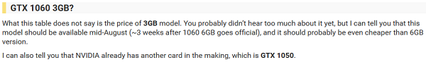 «...احتمالاً درباره نسخه 3 گیگابایتی کارت GeForce GTX 1060 چیز زیادی نشنیدهاید اما میتوانم به شما بگویم که این مدل از اواسط ماه آگوست (تقریباً 3 هفته پس از آغاز فروش مدل 6 گیگابایتی) عرضه میشود و انتظار میرود از مدل 6 گیگابایتی ارزانتر باشد. همچنین میتوانم به شما بگویم هم اکنون انویدیا مشغول ساخت یک کارت گرافیک دیگر، GeForce GTX 1050 است.»