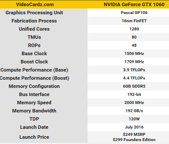 GeForce GTX 1060 بر پایه تراشهای با کُد GP106 است که با بکارگیری فناوری ساخت 16 نانومتری FinFET تولید میشود. این تراشه دارای تعداد 1،280 هسته CUDA در قالب 10 واحد SM، تعداد 80 واحد TMU، تعداد 48 واحد ROP و رابط حافظه GDDR5 با پهنای 192 بیت است. این کارت از 6 گیگابایت حافظه ویدئویی GDDR5 با فرکانس موثر 8 گیگابیت بر ثانیه بهره میبرد که پهنای باند حافظه 192 گیگابایت بر ثانیه را فراهم میکند. توان حرارتی پردازنده گرافیکی GTX 1060 تنها 120 است و توان مورد نیاز مدل مرجع این کارت توسط یک عدد کانکتور تغذیه 6 پینی تامین میشود. درگاههای خروجی تصویر این کارت از سه عدد DisplayPorts 1.4، یک عدد HDMI 2.0b و یک عدد DVI تشکیل شده است.