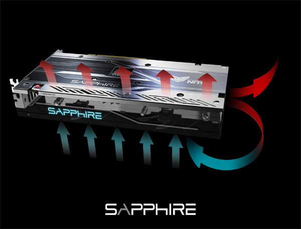 یکی از ویژگی های قابل توجه این کارت، بک پلیت فلزی آن است. این بک پلیت از طراحی ویژه ای بهره می برد که باعث تسریع دفع هوای داغ می شود. لوگوی SAPPHIRE که بر روی محفظه کولر نقش بسته، دارای نور زمینه LED است. فن های این کارت از طراحی ویژه ای به نام FanSafe بهره می برد که دو ویژگی قابل توجه دارد. به دلیل تیز نبودن تیغه های این فن ها، در صورت برخورد اتفاقی دست با فن های در حال چرخش، هیچ گونه آسیبی ایجاد نخواهد کرد. دومین ویژگی FanSafe، گیر نکردن فن ها به سیم های محکم نشده درون کیس است که شانس شکستن تیغه های فن ها بر اثر برخورد با دست و یا کابل های درون کیس را کاهش می دهد. این فن ها همچنین قابل جداسازی هستند و کاربر می تواند کولر را تمیز کند.