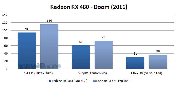 پس از دریافت و اعمال این وصله، گیمر می تواند با مراجعه به بخش تنظیمات بازی، اجرا با رابط برنامه نویسی OpenGL یا Vulkan را انتخاب کند. وب سایت guru3d پس از انتشار این وصله با درایور نسخه 16.7.2 و کارت گرافیک Radeon RX 480 به بررسی تغییر کارایی با کارت های گرافیک AMD پرداخته است. همانطور که در نمودار فوق مشاهده می کنید نتیجه برای دارندگان کارت های گرافیک AMD فوق العاده است. در وضوح تصویر Full HD، با بکارگیری Vulkan نرخ فریم دهی حدود 20 فریم افزایش می باید و این عالی است.