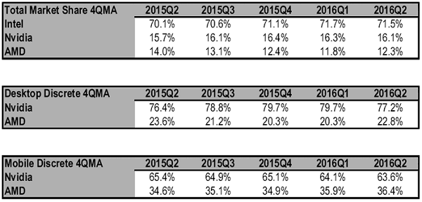 جدیدترین آمار از بازار کارت های گرافیک مجزا نشان می دهد انویدیا با 77.2 درصد پیشتاز است. در طرف دیگر AMDا 22.8 درصد بازار را به خود اختصاص داده است. با در نظر گرفتن این واقعیت که این گزارش مربوط به دوره پیش از عرضه کارت های گرافیک سری AMD Radeon RX 400 است، احتمالاً گزارش آتی نتایج قابل توجه تری با خود خواهد داشت.