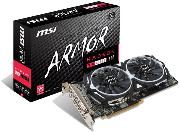 MSI دو مدل از کارت RX 480 Armor به نام های 4G و 8G عرضه می کند که به ترتیب دارای 4 و 8 گیگابایت حافظه ویدئویی هستند. پردازنده گرافیکی Polaris 10 XT مورد استفاده در Radeon RX 480 دارای 2304 پردازنده جریانی (واحد سایه زنی) است که فرکانس بوست آن در مدل معمولی بRX 480 Armor به 1266 مگاهرتز می رسد.