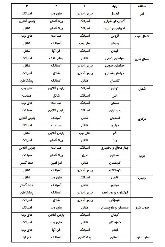 وضعیت رتبهبندی سه اپراتور برتر از نگاه مشتریان در مناطق سازمان تنظیم مقررات و ارتباطات رادیوئی به تفکیک هر استان در جدول زیر درج شده است.