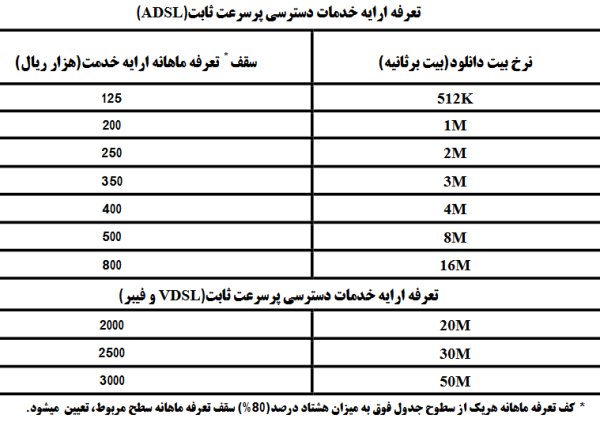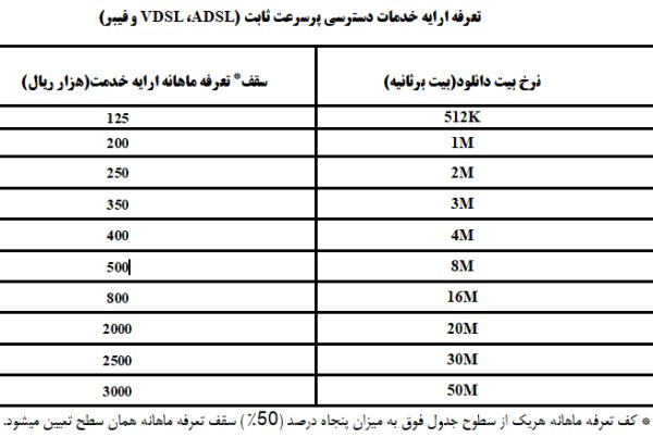 بر این اساس کف تعرفه ماهانه هریک از سرعتهای مد نظر در این جدول به میزان ۵۰ درصد سقف تعرفه ماهانه همان سطح تعیین شد. این درحالی است که پیش از این کف تعرفه به میزان ۸۰ درصد سقف تعرفه ماهانه درنظر گرفته شده بود. به این معنی که اپراتور می تواند تا ۵۰ درصد کمتر از قیمت مصوب، برای کاربر خود تعرفه تعیین کند.