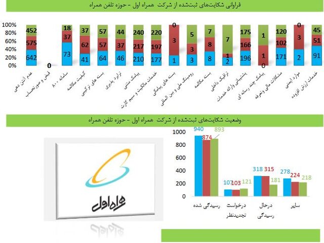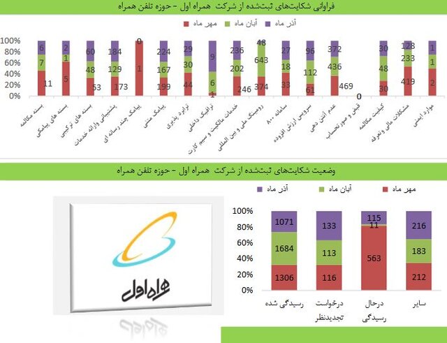 شکایات ثبتشده از شرکت همراه اول در آذرماه در بخش پشتیبانی و ارائه خدمات در مقایسه با شهریورماه، ۷۱ درصد افزایش، در بخش کیفیت سرویس 18 درصد افزایش و در بخش مشکلات مالی و تعرفه ۲۳ درصد افزایش داشته است.