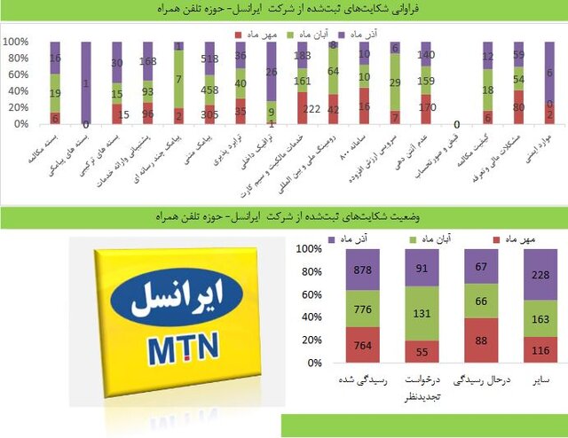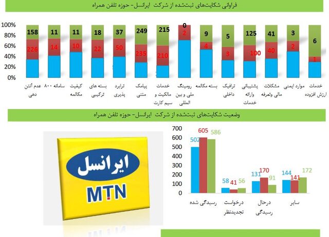شکایات ثبتشده از شرکت ایرانسل در آذرماه در بخش پشتیبانی و ارائه خدمات در مقایسه با شهریورماه، ۲۲۴ درصد افزایش، در بخش کیفیت سرویس ۲۸۰ درصد افزایش و در بخش مشکلات مالی و تعرفه ۱۸۶ درصد افزایش داشته است.
