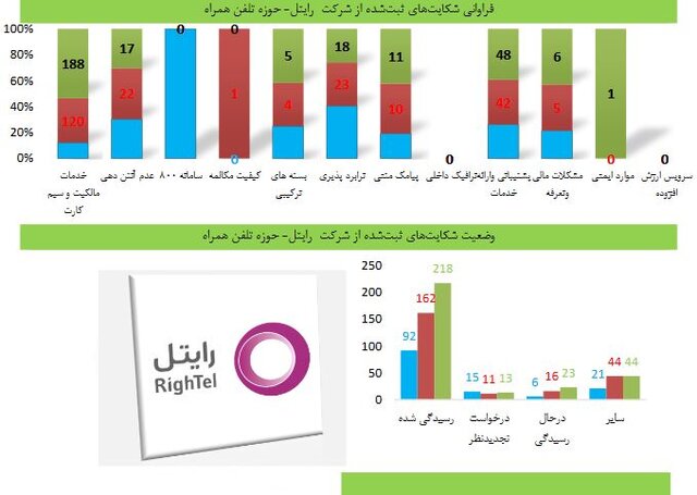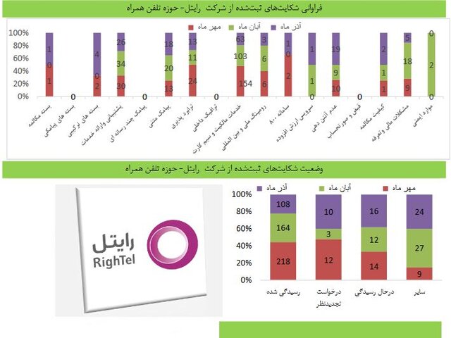 شکایات ثبتشده از شرکت رایتل در آذرماه در بخش پشتیبانی و ارائه خدمات در مقایسه با شهریورماه، ۱۱۶۰ درصد افزایش، در بخش کیفیت سرویس ۱۳۷ درصد افزایش و در بخش مشکلات مالی و تعرفه ۱۱۱ درصد افزایش داشته است.