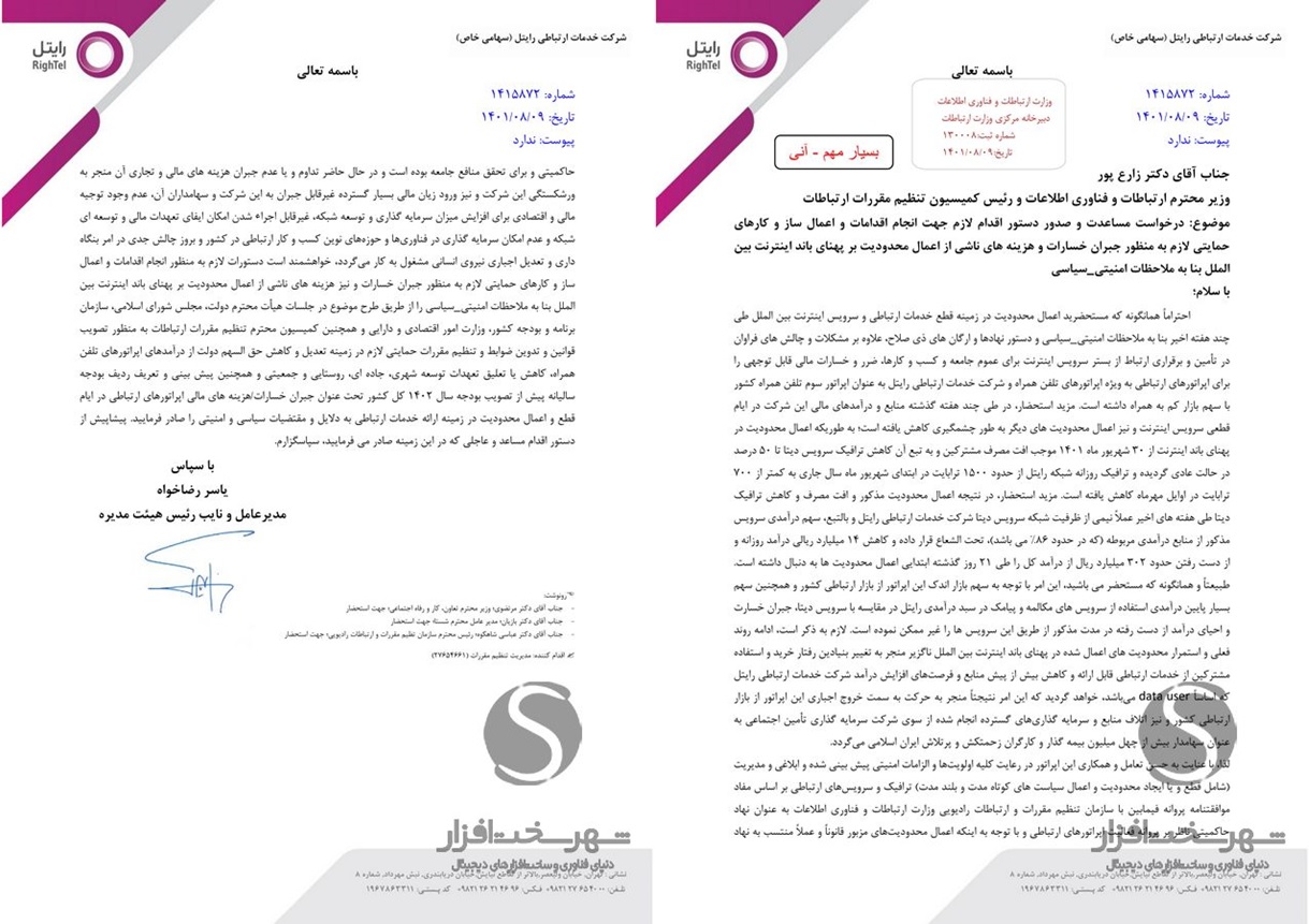 رایتل سومین اپراتور بزرگ کشور و تنها رقیب ایرانسل و همراه اول است. اما به نظر در پی اعمال محدودیتهای شدید اینترنت طی سه ماهه گذشته، وضعیت این شرکت در شرایط نابسامانی قرار گرفته است. در همین زمینه مدیر عامل این شرکت با ارسال نامهای به وزیر ارتباطات اعلام کرد که در صورت ادامه شرایط محدودیت اینترنت در ایران احتمال ورشکستگی رایتل وجود دارد.