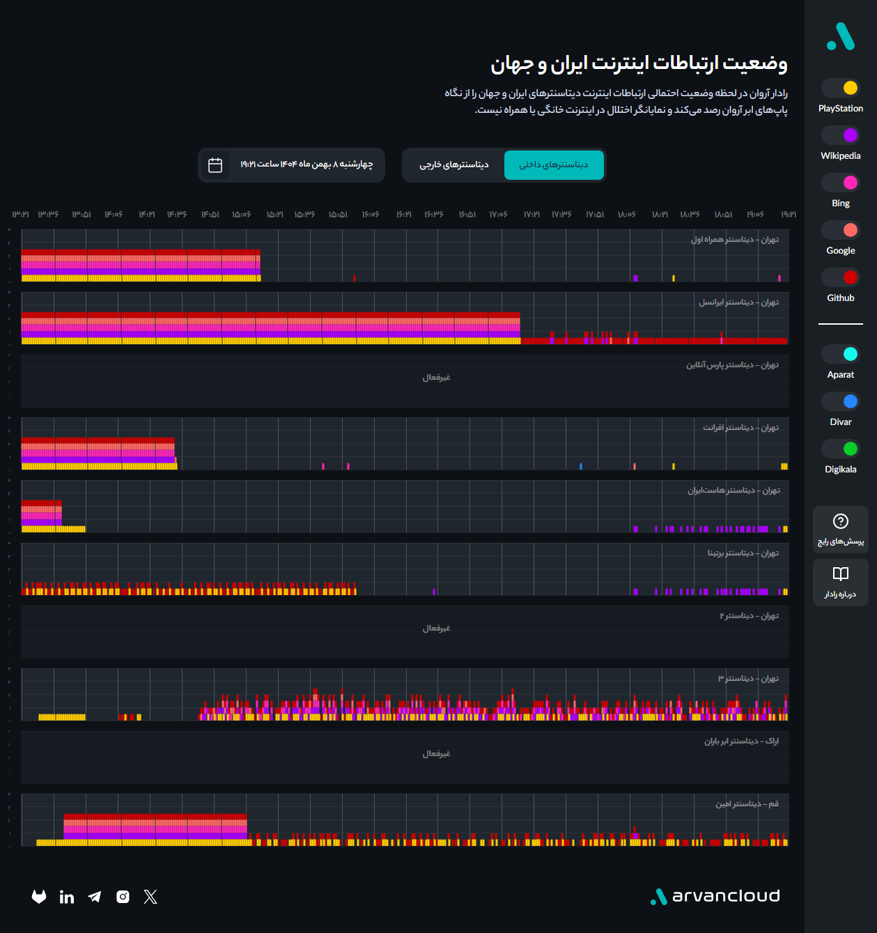 در کنار گزارشهای کاربران، دادههای لحظهایِ اتصالِ منتشرشده در رادار ابر آروان نیز این تغییر وضعیت را تأیید میکند. مطابق این دادهها، اتصال اینترنت بینالملل در برخی دیتاسنترهای اصلی کشور از جمله افرانت و سپس سایر مراکز بهصورت مرحلهای برقرار شده است. البته این اتصال در ساعات اولیه با ناپایداری و قطعووصل همراه بوده و حتی در مقاطعی مجدداً از دسترس خارج شده است.
