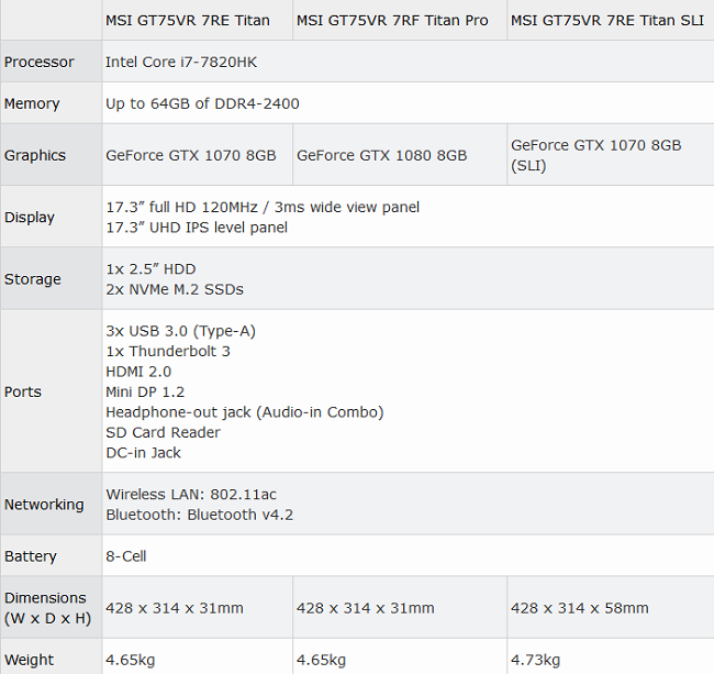 به ادعای این کمپانی GT75VR Titan اولین لپ تاپ گیمینگ دنیا با درگاه شبکه کابلی 10 گیگابیتی است. از دیگر قابلیت های این لپ تاپ می توان تا 64 گیگابایت حافظه رم DDR4 با فرکانس 2400 مگاهرتز، تا دو M.2 SSD پرسرعت نوع NVMe، درگاه USB 3.1 نوع C، درگاه های خروجی تصویر HDMI و Mini DisplayPort، بلوتوث 4.1، وب کم full HD و باتری 8 سلولی را برشمرد. برای نمایشگر امکان انتخاب میان دو پنل 17.3 اینچی، یکی با وضوح full HD ، نرخ نوسازی تصویر 120 هرتز و زمان پاسخدهی 3 میلی ثانیه و دیگری IPS با وضوح UHD وجود دارد.