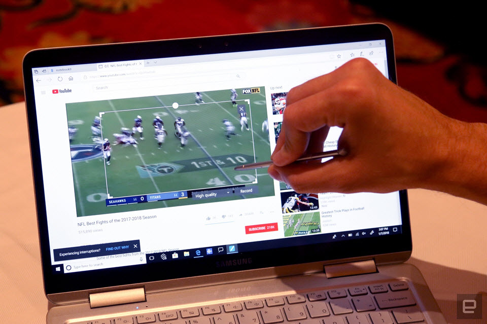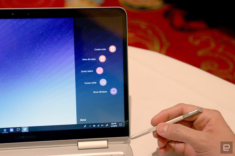 سامسونگ تعدادی لپتاپ را در این نمایشگاه معرفی کرد، ولی جالبترین این لپتاپها لپتاپ Notebook 9 Pen است. این اولین باری نیست که سامسونگ قلم S Pen را در داخل یک لپتاپ ویندوزی جای میدهد، سال گذشته شاهد لپتاپ Notebook 9 Pro بودیم. ولی امسال لپتاپی سبکتر، باریکتر و به لطف پردازندههای نسل 8 اینتل بسیار قویتر داریم.