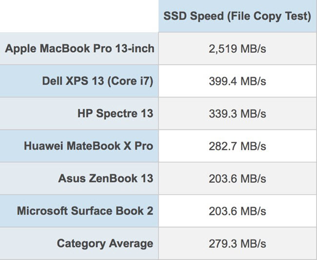 تست کپی فایل انجام شده بر روی این مکبوک پرو جدید نتیجه خیرهکننده 2.5 گیگابایت بر ثانیه را برجای گذاشت. اپل ادعا میکند این SSD میتواند سرعت خواندن تا 3.2 گیگابایت بر ثانیه و نوشتن تا 2.2 گیگابایت بر ثانیه را فراهم کند. این سرعتها از هر SSD دیگری که در لپتاپها به کار رفته بالاتر است و حتی کانفیگهای با SSDهای با حجم بالاتر ممکن است سرعتهای بیشتری را به ثبت برسانند. همچنین یک تست با نرمافزار BlackMagic نیز انجام شد که میانگین سرعت نوشتن 2,682 MB/s را برجای گذاشت. البته این همهی ماجرا نیست فایل سیستم جدید اپل با نام APFS در واقع طراحی شده تا سرعت کپی را با تکنولوژی Apple Instant Cloning افزایش دهد.
