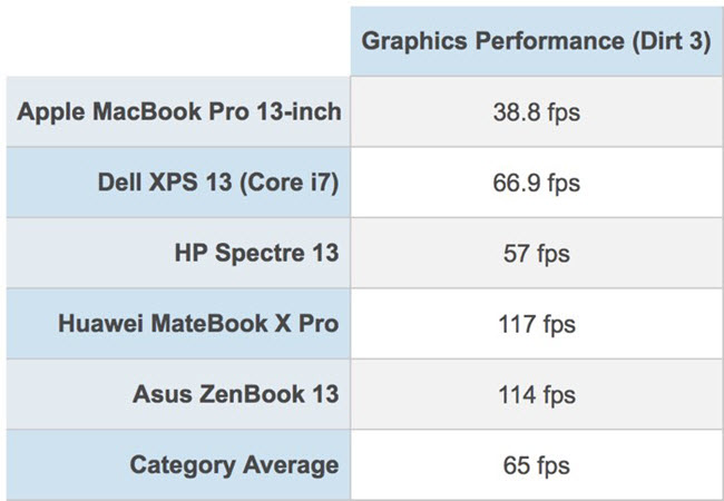 در زمینه ای که مکبوکها همیشه مشکل داشتهاند مکبوکهای جدید نیز مشکل دارند. در تست های گرافیکی انجام شده مکبوک پرو 13اینچی جدید اپل نتوانست به رقیبان ویندوزی خود نزدیک شود. علت این امر نداشتن گرافیک خوب و بسنده کردن اپل به استفاده از گرافیک اینتل با 128 مگابایت حافظه اختصاصی است.