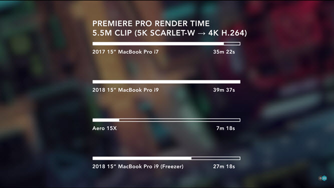 تست دیگری که واقعا جای تأمل دارد، تست زمان رندر ویدئو است. در این تست یک لپتاپ دیگر به جمع اضافه شد، مکبوک پرو سال قبل با پردازنده i7 و 4 هسته پردازشی. قویترین مک بوک امسال در این تست از مدل قبلی خود شکست خورد. البته این تست یک بخش دیگر هم دارد Dave Lee این رندر را با استفاده از مکبوک سال 2018 در فریزر نیز انجام داد و 10 دقیقه از زمان رندر کم شد و این بار نتیجه نسبت به مکبوک سال 2017 بهتر بود. اما اگر در فریزر زندگی نمیکنید باید به این نکته توجه داشته باشید که این مکبوک در خارج از فریزر با مشکلات دمایی جدی روبرو است و اپل بدون توجه به این مسئله محصول جدید خود را روانه بازار کرده است. اما این همه ماجرا نیست، لپتاپ Aero 15X که پیش از این به آن اشاره کردیم در مدت زمانی که یکی از این مکبوکها مشغول به رندر است میتواند همان رندر را 5 بار تمام کند این مسئله به این خاطر است که Adobe Premiere Pro در ویندوز کمی بهتر از مک عمل میکند و همچنین این لپتاپ دارای قدرت خنککنندگی بسیار بالایی است.