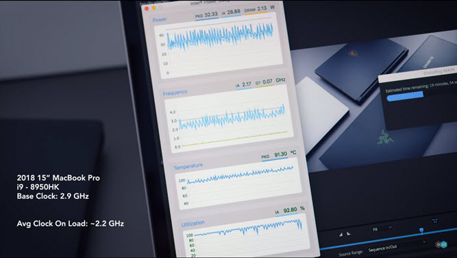 پردازنده 6 هستهای اینتل Core i9-8950HK با فرکانس پایه 2.9 گیگاهرتز برای مکبوکهای 15 اینچی 2018 یک اپشن 300 دلاری به حساب میآید. اما بررسیهای Dave Lee یوتیوبر مشهور بر روی این لپتاپ نشان میدهد که این لپتاپ به هیچ عنوان توانایی کنترل دمای این پردازنده 2.9 گیگاهرتزی را ندارد. پردازنده Core i9-8950HK یک پردازنده با قابلیت اورکلاک شدن است؛ ولی وقتی سیستم خنککننده داخل این لپتاپ نمیتواند حتی این پردازنده را در فرکانس پایه ثابت نگه دارد؛ این قابلیت به هیچ دردی نمیخورد. طبق تستهای این یوتیوبر پردازنده داخل این لپتاپ به مقدار زیادی دچار Thermal Throttle میشود. او این نتیجهگیری را از آنجایی کرده است که نوسانات بسیار زیادی در فرکانس موقع فشار به پردازنده مشاهده میشود. این نوسانات بازهای از 2 گیگاهرتز تا 3 گیگاهرتز دارند، میانگین این نوسانات به ما فرکانسی را در حدود 2.2 گیگاهرتز میدهد. همچنین نوسانات دمایی نیز بازه 90 تا 100 درجه را شامل میشوند که موضوع گلوگاه دمایی را تأیید می کند چرا که پردازنده نمیتواند فرکانس پایه 2.9 گیگاهرتزی خود را حفظ نماید. در واقع این اتفاق آنقدر بد است که مقایسهای که از این پردازنده با لپتاپ Aero 15X مدل 2018 در زمینه مدیریت دما انجام شد؛ پردازنده به کار رفته در مکبوک با فرکانس پایه 2.9 گیگاهرتز حتی اگر می توانست فرکانس پایه خود را ثابت نگه دارد، نمی توانست پردازنده i7-8750H با فرکانس پایه 2.2 گیگاهرتزی را شکست دهد. این به این خاطر است که Aero 15X سیستم خنککننده بسیار قوی دارد و میتواند این پردازنده را به قدری خنک کند که این پردازنده میانگین فرکانس 3.1 گیگاهرتزی را در زیر استرس به ثبت برساند. این درحالی است که در لپتاپ Aero 15X دمای پردازنده تنها چیزی در حدود 80 تا 90 درجه سانتیگراد بود.