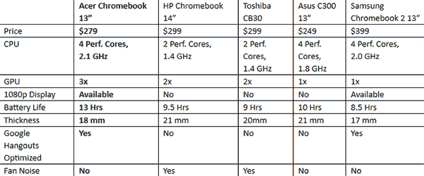 ضمناً در جدول زیر مقایسه ای کلی بین Acer Chromebook 13 و محصولات مشابه مشاهده می نمایید.