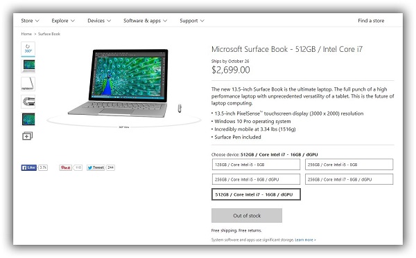رده بالاترین و گران قیمتترین پیکربندی Surface Book با 512 گیگابایت حافظه ذخیره سازی از نوع SSD، پردازنده Core i7، ا16 گیگابایت حافظه رم و پردازنده گرافیکی مجزای انویدیا 2699 دلار قیمت دارد و همین مدل نیز با اتمام موجودی همراه بوده است. در حالی که اتمام موجودی رده بالاترین پیکربندی Surface Book میتواند به دلیل استقبال بالا باشد، اما هم زمان میتواند به دلیل محدودیت در تولید اولیه نیز باشد، به خوبی میدانیم که اغلب سازندگان معمولاً محصولات گران قیمت جدید را با احتیاط بالایی تولید و سپس با تحلیل بازخوردهای اولیه، حجم تولید انبوه آن را تعیین میکنند.
