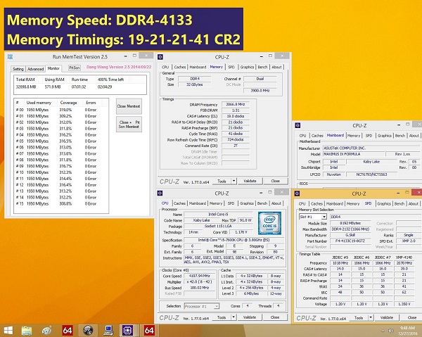 اگر با اورکلاکینگ حافظه آشنایی داشته باشید، احتمالاً می دانید که با بالا رفتن حجم حافظه افزایش فرکانس دشوار می شود. با تکیه بر دهه ها تجربه در تولید ماژول های حافظه، G.SKILL محدودیت ها برای کیت های 32 گیگابایتی متشکل از چهار ماژول 8 گیگابایتی را درهم کوبیده و به فرکانس 4133 مگاهرتز دست یافته است. تصویر زیر آزمایش موفقیت آمیز کیت 32 گیگابایتی Trident Z با فرکانس 4133 مگاهرتز و تایمینگ CL19-21-21-41 را بر روی مادربرد ROG Maximus IX Formula ایسوس نشان می دهد.