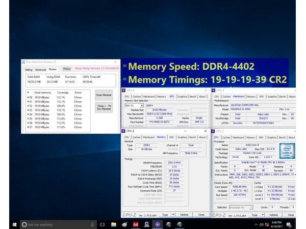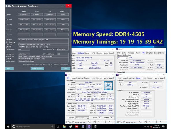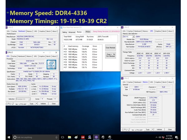 این سازنده تصویری از آزمایش کیت جدید خود از Trident Z منتشر کرده که آن را با فرکانس 4333 مگاهرتز با تایمینگ CL19-19-19-39 با ولتاژ 1.40 ولت و همچنین با فرکانس 4500 مگاهرتز با تایمینگ CL19-19-19-39 نشان می دهد. هر دو تست بر روی مادربرد ROG Maximus IX Apex ایسوس با همراهی پردازنده Core i5-7600K انجام شده اند.
