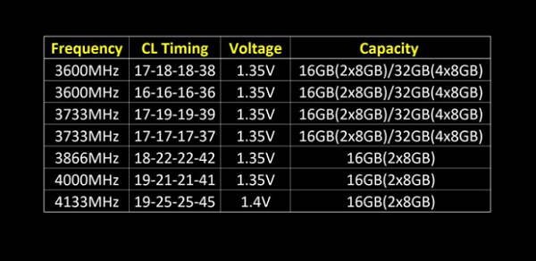 کیتهای حافظه پر سرعت Trident Z extreme که در قالب ماژولهای 8 گیگابایتی عرضه میشوند، اکنون در فرکانس 3600 مگاهرتز تا 4133 مگاهرتز در دسترس هستند. ماژولهای بسیار پرسرعت با فرکانس بالای 4 گیگاهرتز، تنها در قالب کیتهای 16 گیگابایتی متشکل از دو ماژول 8 گیگابایتی عرضه می شوند. در همین حال کیتهای 32 گیگابایتی حداکثر با فرکانس 3733 مگاهرتز عرضه میشوند.