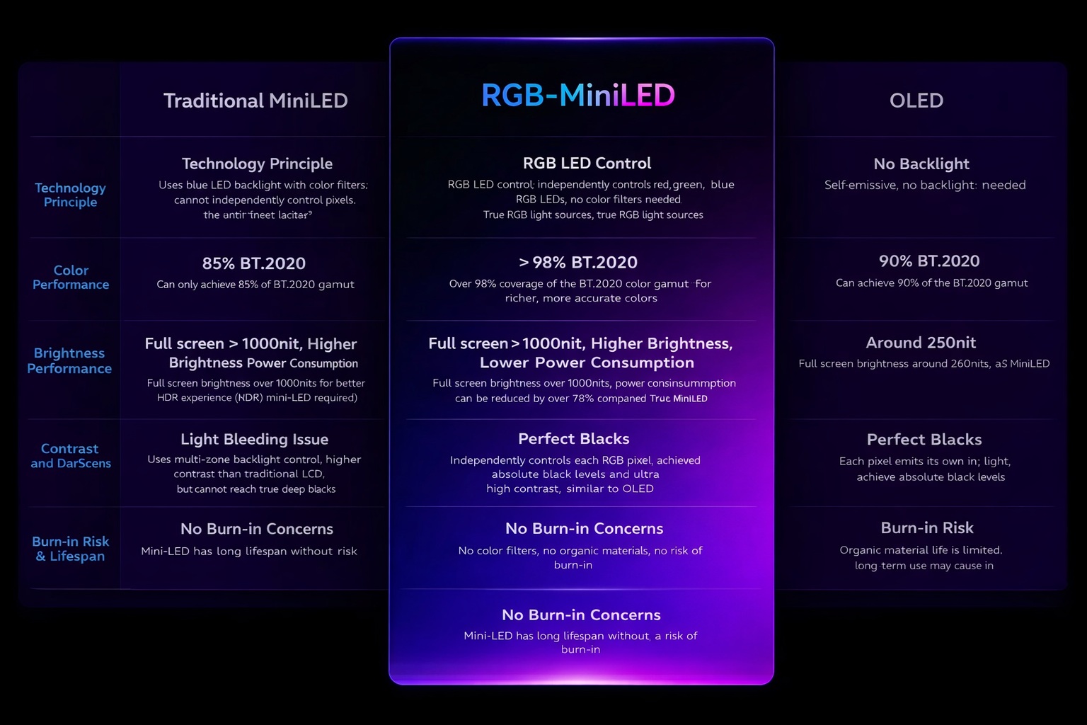 در مانیتورهای Mini LED رایج، معمولاً از LEDهای سفید یا آبی در کنار فیلترهای رنگی استفاده میشود؛ رویکردی که باعث اتلاف نور و افت خلوص رنگ، بهویژه در صحنههای پرکنتراست میشود. اما در فناوری RGB Mini LED، تراشههای قرمز، سبز و آبی مستقیماً در نور پسزمینه بهکار رفتهاند. به این ترتیب، هنگام نمایش هر رنگ، فقط همان LED فعال میشود و دیگر نیازی به فیلتر رنگی نیست. نتیجه این طراحی، کاهش اتلاف نور، افزایش دقت رنگ و بهبود محسوس کنتراست تصویر است.