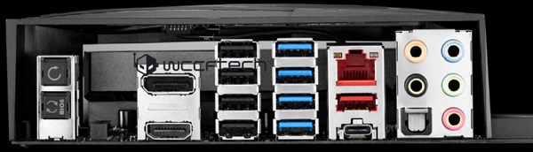 پنل ورودی-خروجی این مادربرد میزبان دو درگاه USB 3.1 (یکی نوع A و یکی نوع C)، چهار USB 3.0، چهار USB 2.0، درگاه شبکه کابلی گیگابیتی مبتنی بر کنترلر I219-V اینتل، درگاه HDMI 1.4، درگاه DP 1.2 در کنار دکمه بازنشانی تنظمیمات بایوس و بروزرسانی بایوس است. همچنین جک های سیستم صوتی 7.1 کاناله نیز در پنل پشتی مادربرد یافت می شود.