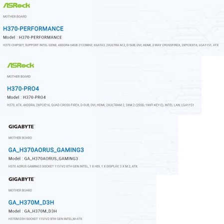 برخی فروشگاههای آسیایی مادربردهای جدید مبتنی بر چیپ ستهای H370، B360 و H310 اینتل را لیست کردهاند که در برگیرنده مدلهایی از گیگابایت و ازراک است. در میان این مادربردها هر دو بردهای ساخته شده در فرم فاکتور ATX و ITX به چشم میخورد.