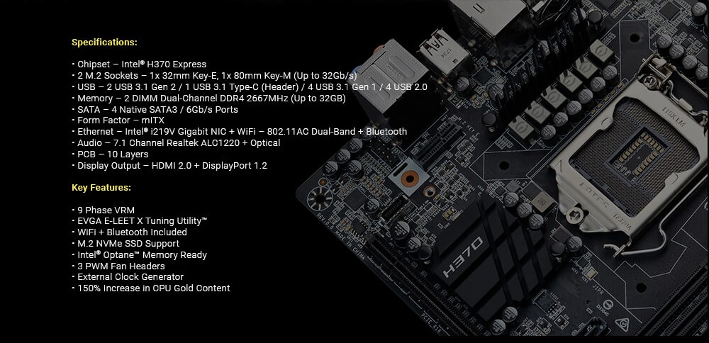 EVGA H370 Stinger یک مادربرد از نوع mini-ITX است که در ردهی قطعات خوش قیمت و اقتصادی برای کاربران سیستمهای خانگی یا گیمینگ قرار میگیرد.