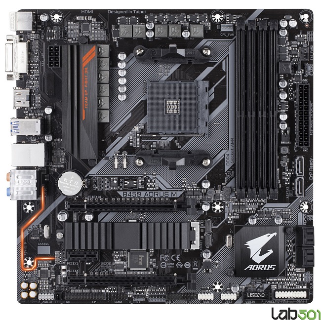 B450 Aorus M در فرم فاکتور micro-ATX ساخته شده اما از قابلیتهای بسیار غنی برخوردار است. این مادربرد دارای مدار تغذیه مشابه مدل بزرگتر است. گیگابایت در این مدل فقط یک شکاف M.2-22110 نصب کرده که درست همانند مدل بزرگتر پهنای گذرگاه آن با شکاف PCI-Express 3.0 x16 مشترک است. دیگر ویژگیهای این دو مادربرد مشابه است، البته صدای آنبورد B450 Aorus M قدی تقلیل یافته است و خبری هم از درگاه نوع C نیست.