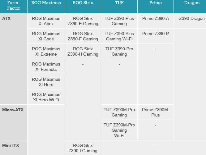 ایسوس دست کم پنج گروه مادربرد جدید، شامل سری ROG Maximus XI، سری ROG Strix، سری TUF، سری Prime و یک سری جدید به نام Dragon را عرضه کند. هنوز ماهیت سری Dragon مشخص نیست اما می دانیم دست کم یک مدل تحت آن عرضه میشود.