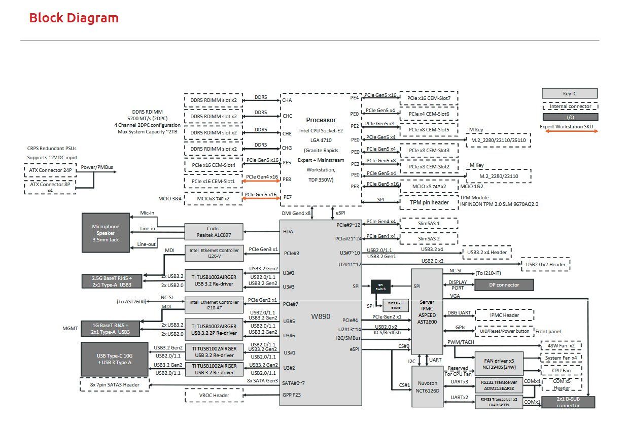 تغذیه این پلتفرم از طریق یک کانکتور 24 پین ATX و حداکثر چهار کانکتور 8 پین ATX انجام میشود تا انرژی پردازندههای 350 واتی Granite Rapids تأمین شود. به طور کلی، پلتفرم W890 با ویژگیهای کامل خود میتواند رقیب مناسبی برای AMD Threadripper 9000 باشد و انتظار میرود در CES 2026 رسماً معرفی شود.