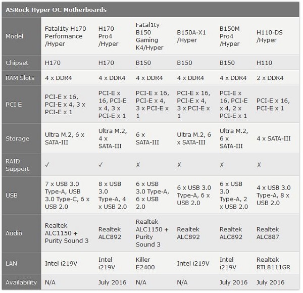 در جدول زیر مشخصات مادربردهای سری Hyper OC آمده است: